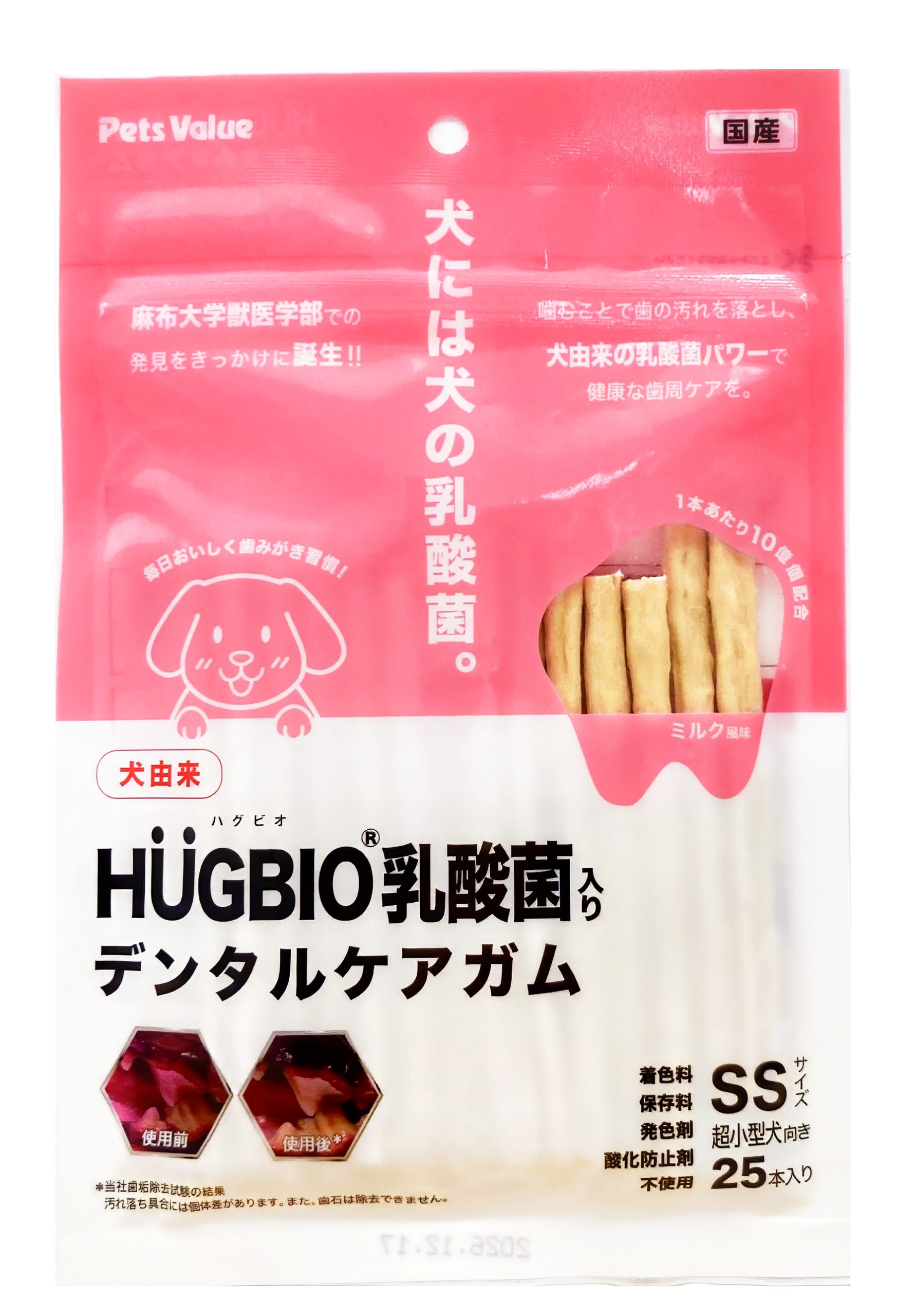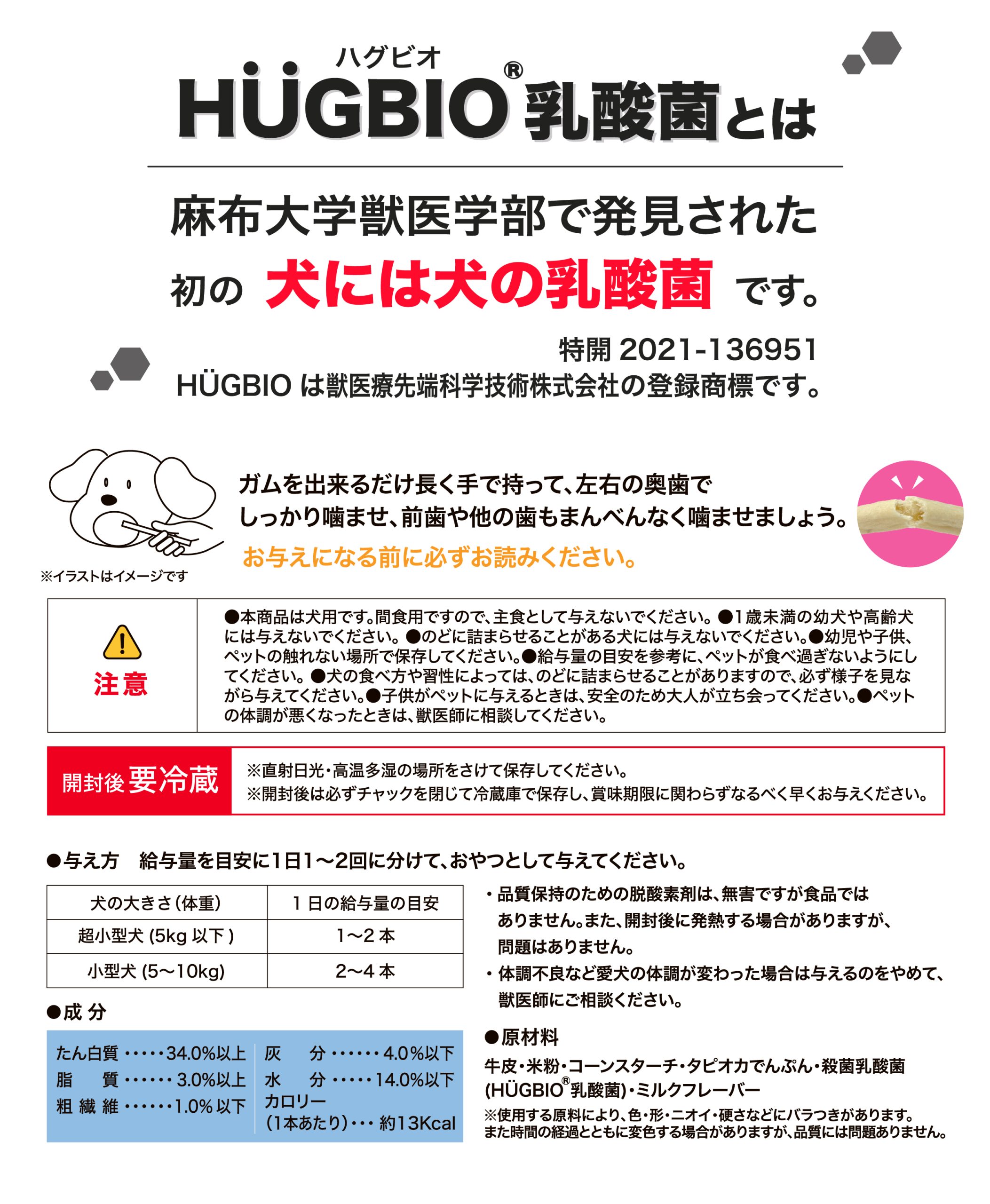 - [原材料]牛皮・米粉・コーンスターチ・タピオカでんぷん・殺菌乳酸菌(ハグビオ乳酸菌)・ミルクフレーバー